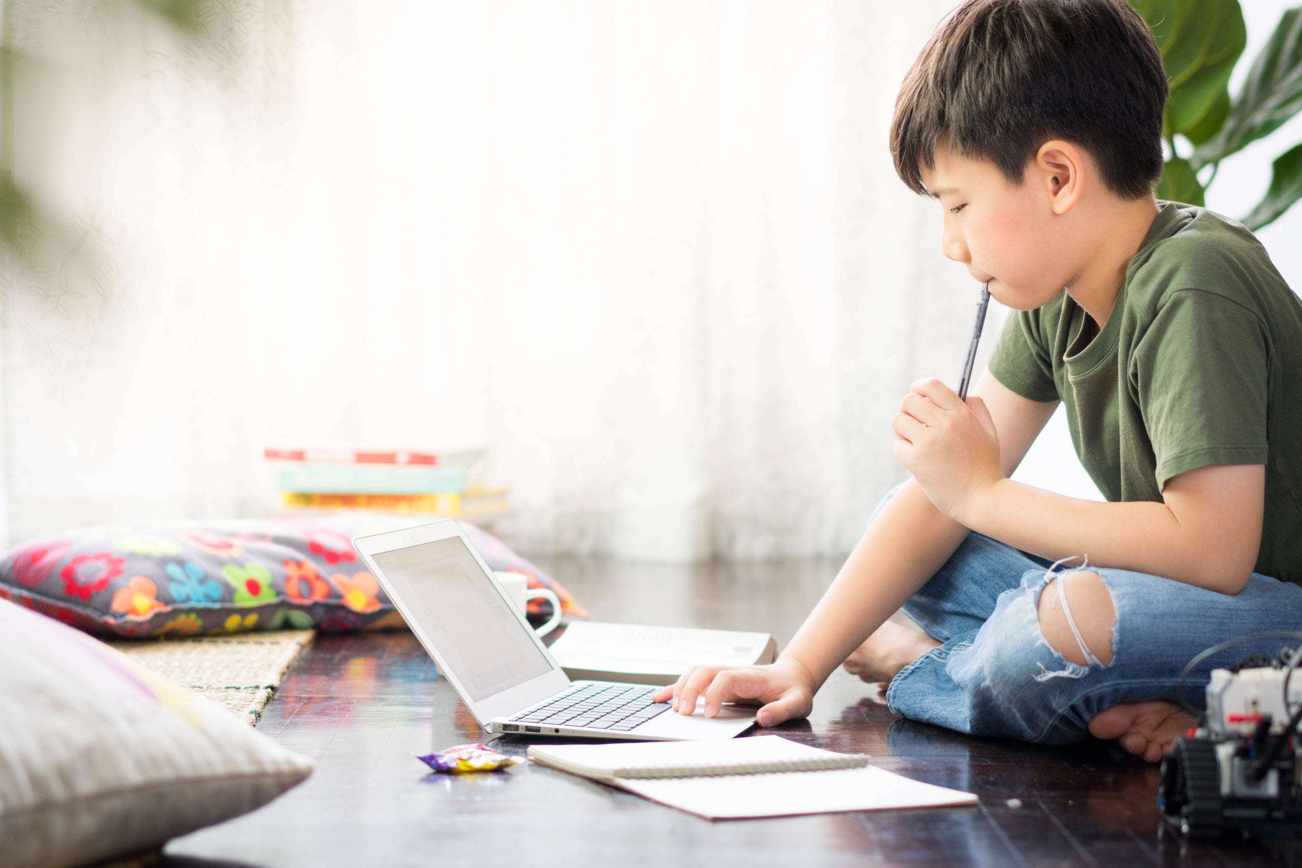 Smart looking Asian preteen boy sit crossed legs, holding pen ag